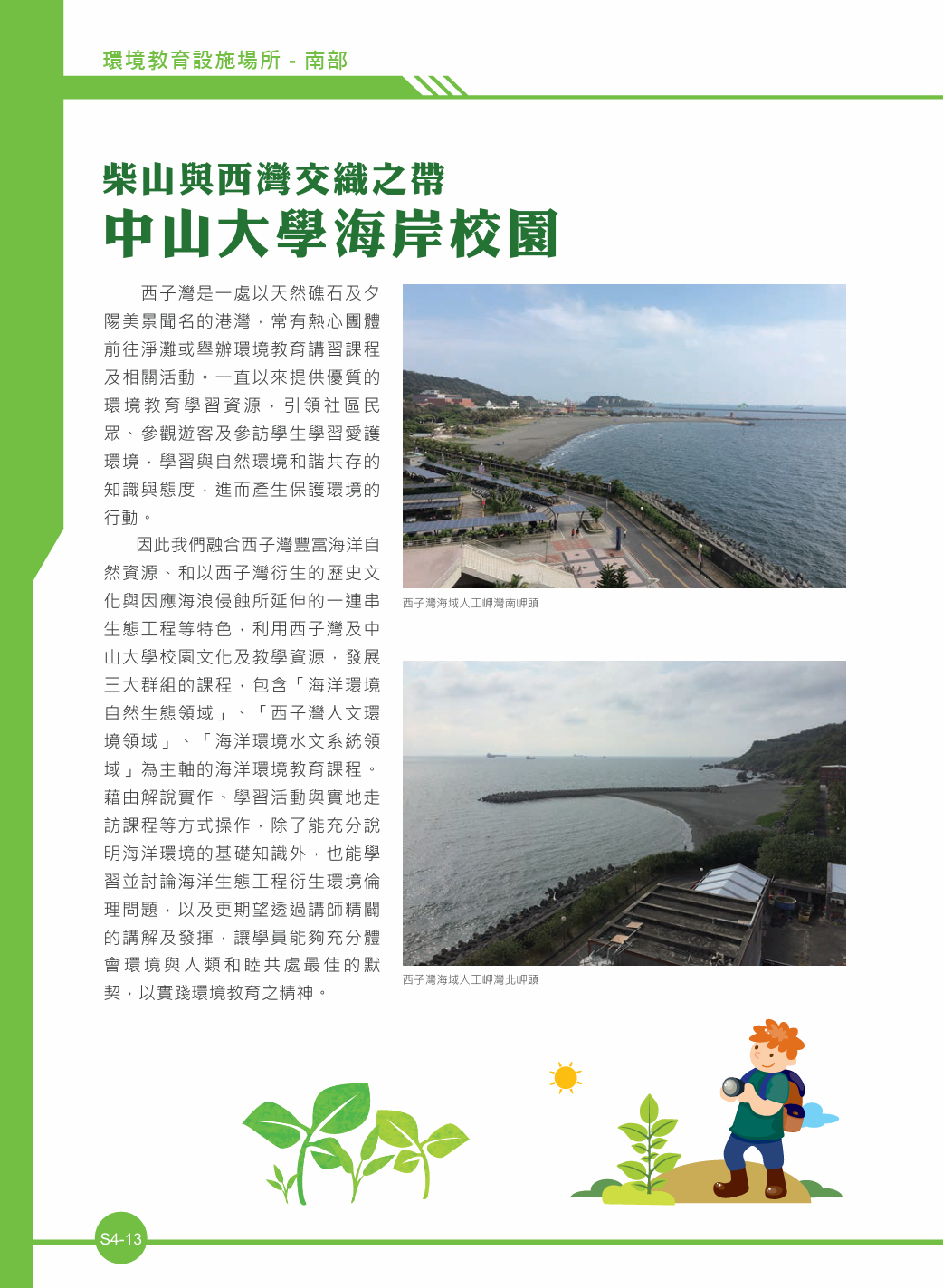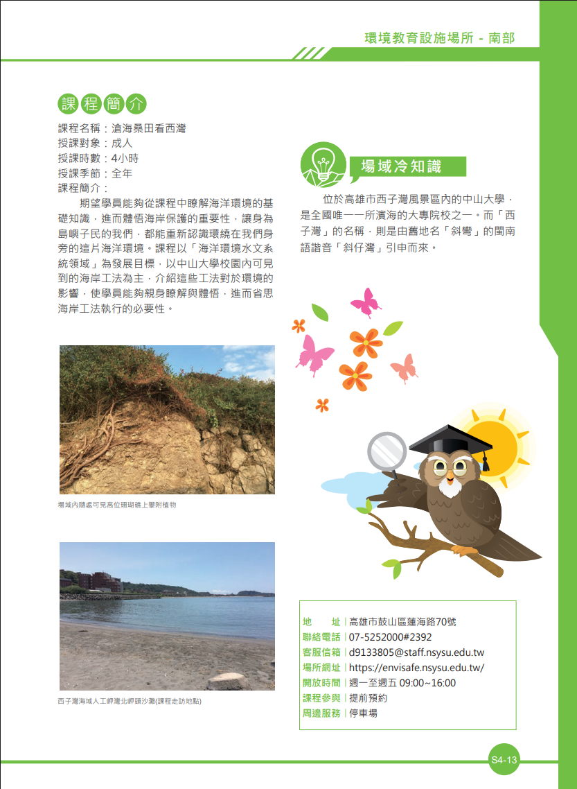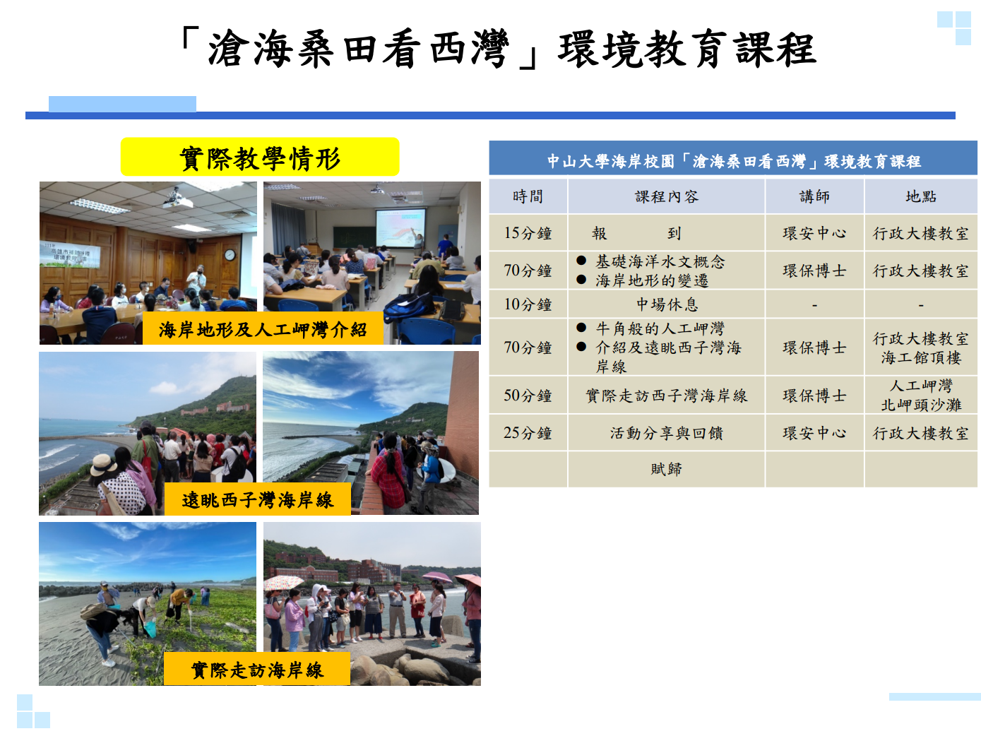 - 針對高中以上學生及社會人士之環境教育課程 - 「滄海桑田看西灣」。融合西子灣豐富海洋自然資源、和以西子灣衍生的歷史文化與因應海浪侵蝕所延伸的一連串生態工程等特色,利用西子灣及中山大學校園文化及教學資源,發展三大群組的課程,包含「海洋環境自然生態領域」、「西子灣人文環境領域」、「海洋環境水文系統領域」為主軸的海洋環境教育課程。藉由解說實作、學習活動與實地走訪課程等方式操作,除了能充分說明海洋環境的基礎知識外,也能學習並討論海洋生態工程衍生環境倫理問題。