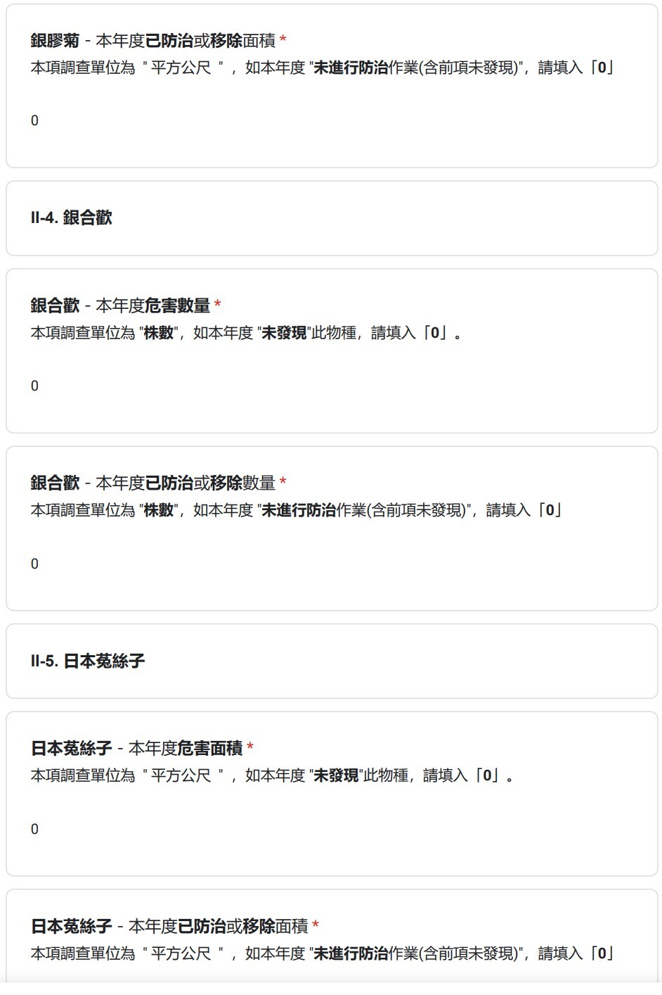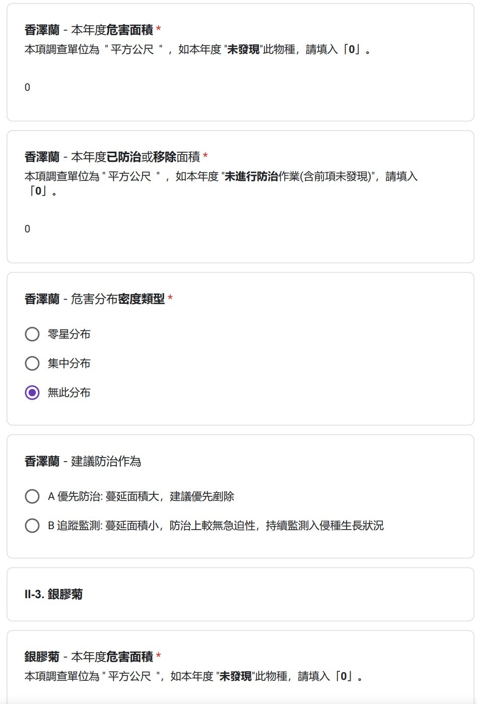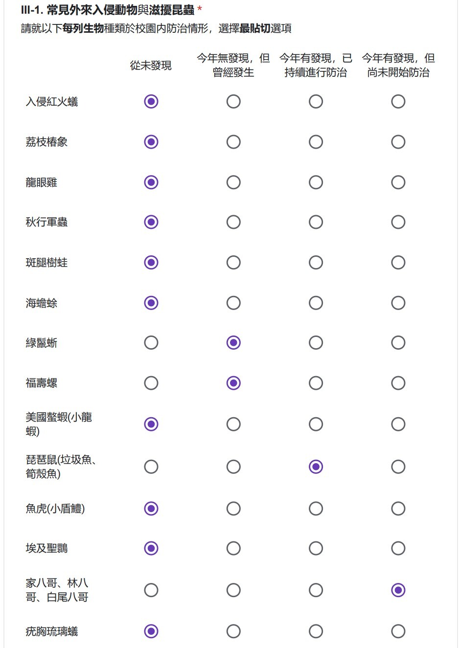 定期巡檢校園,並每年回報教育部「外來種動植物及植物疫病調查表」,並參與外來種防治研習課程。如發現校園內出現外來入侵種則立即清除,以降低外來物種對於本地生態系統的影響。