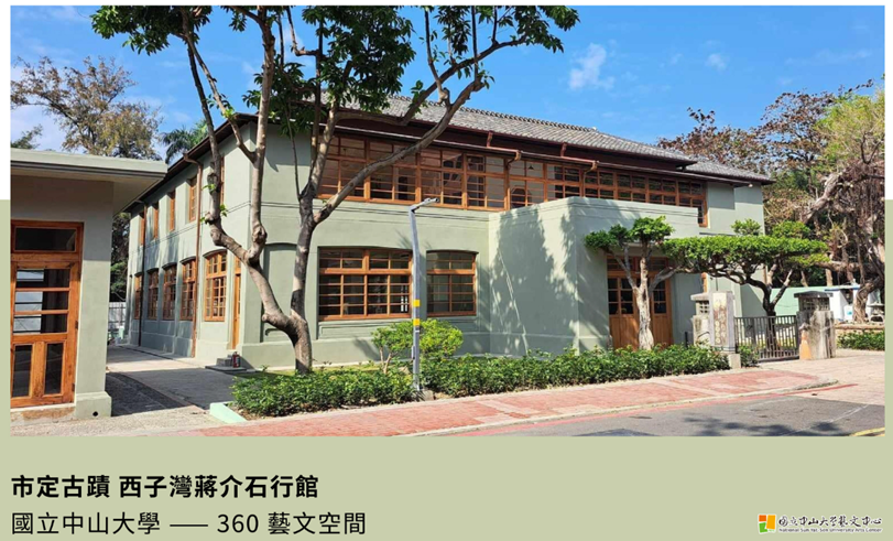 本校基於保存及維護文化資產之立場,並依據相關文資法規於 2023 年 12 月完成古蹟修復工程,本次修復設計採「歷時性保存」原則,將不同時期之風格及構法留存以見證歷史的變遷;另修復後之建築外貌包括正立面復原、圍牆拆除、外牆色彩及帶狀窗之復原等,亦是回應創建時期之建築風貌,此外亦進行溫浴池遺構之復原及保存,將其珍貴之文化資產價值做最完整之呈現,修復後規劃為「360藝文空間」,寓意擁抱壽山及西子灣。並持續作為開放式藝文展示空間,舉辦展覽、講座與演出等活動,除邀請校內教職員生參與外,亦將逐步向社區及社會大眾開放。