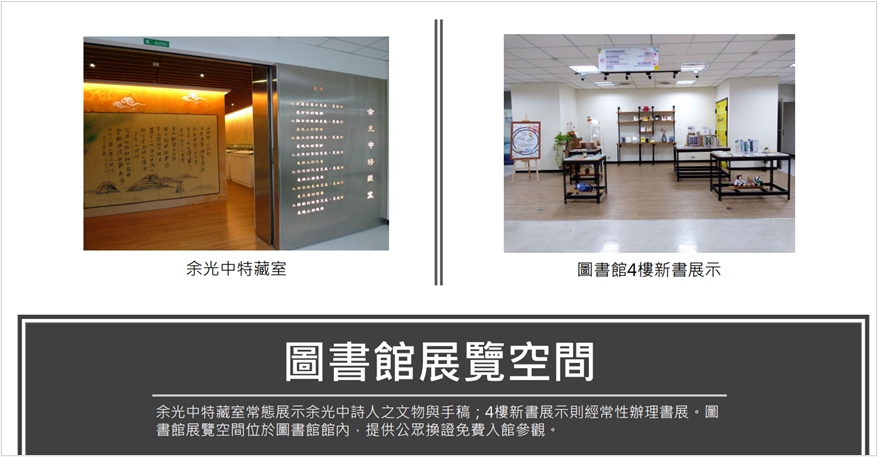 此外,本校亦對外免費開放余光中特藏室、中央藝廊等,供大眾參觀與作為展演空間。