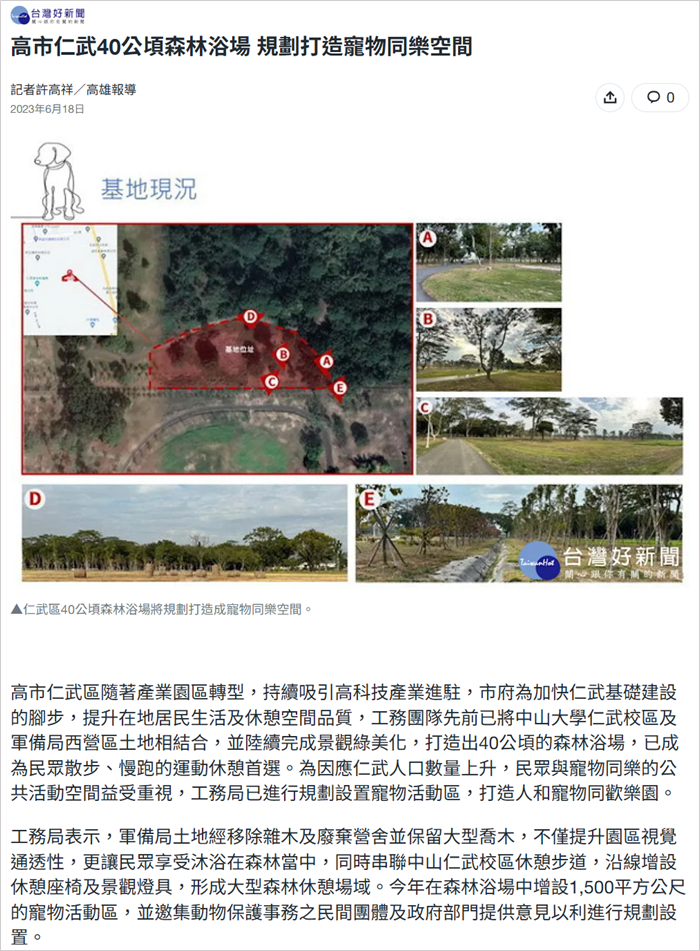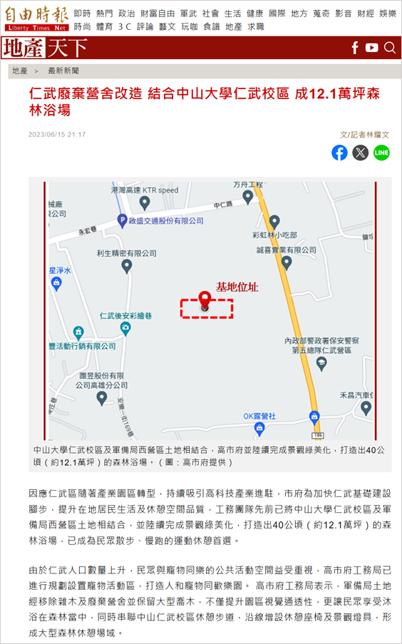 此外,因應仁武區隨著產業園區轉型,持續吸引高科技產業進駐,市府為加快仁武基礎建設腳步,提升在地居民生活及休憩空間品質,工務團隊先前已將中山大學仁武校區及軍備局西營區土地相結合,並陸續完成景觀綠美化,打造出40公頃(約12.1萬坪)的森林浴場,已成為民眾散步、慢跑的運動休憩首選。
