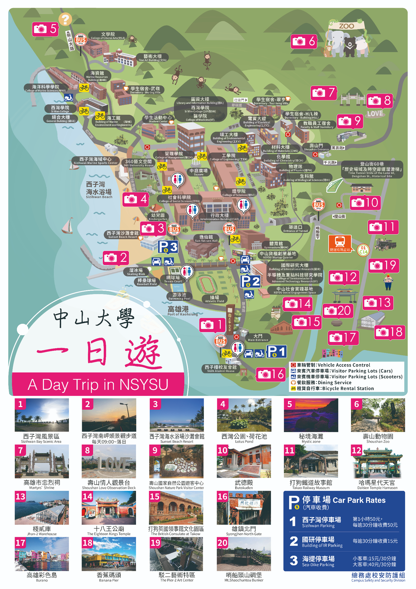 中山大學為一開放式校園,一般民眾不需付費即可進出校園公共空間與綠地。基於安全考量,於夜間進行管制。