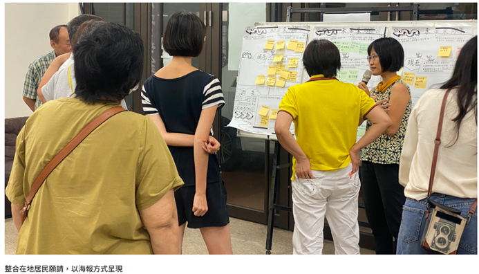 過程中石家蓉導入高齡友善環境設計的知識概念,包含防滑廁所、L型扶手、求助鈴、排煙設備、煙霧偵測器等,都是高齡居家環境需要留意的地方。戶外空間包含椅子設計讓長者好坐、輪椅可用的植栽桌,她強調高齡友善社區的概念,包含長者走路5到10分鐘就能抵達商店、藥局、聊天的空間,半小時可以走到社區活動中心、公園、學校、醫院等,形成社區防護的安全網。「渡.左營」團隊也將工作坊所匯集的意見與成果,提供給合群里辦公室及文化局作為設計參考,期望協助未來里民活動中心可以成為兼具文化保存與樂齡長照的社區據點,同步提升韌性與永續兩項環境概念。