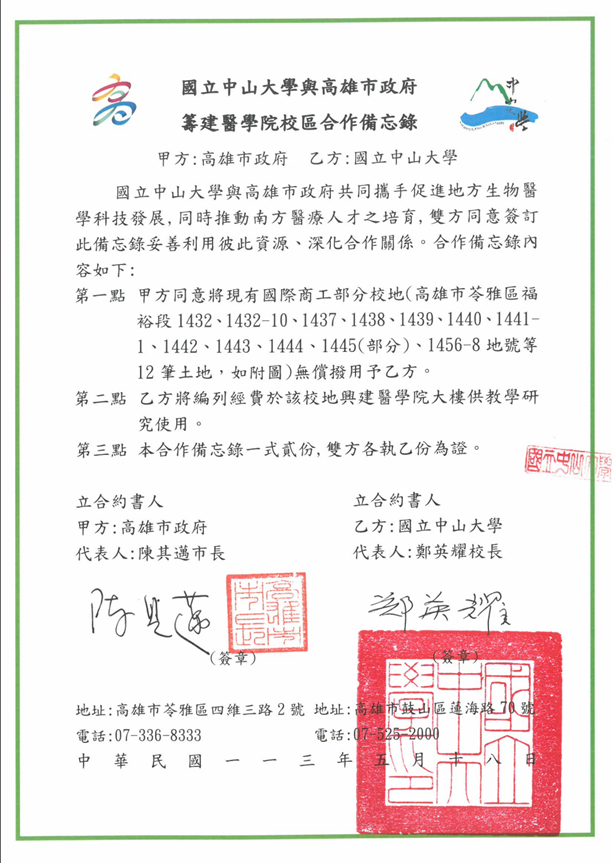 與高雄市政府簽訂合作備忘錄,於現有國際商工校地興建醫學院大樓
