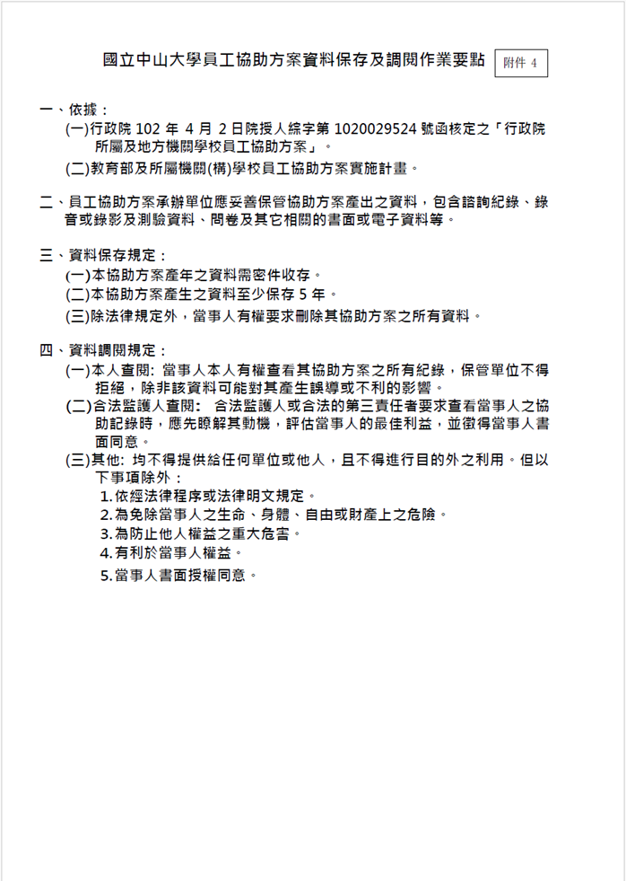 本校推動國立中山大學員工協助方案(EAP)實施計畫,建置「員工協助方案」專區網頁,訂定本校推動員工協助方案處理流程,提供工作面、生活面、健康面的協助,包含提供工作權益相關問題諮詢服務及申訴管道,如教師/職員申訴名義委員會,並透過集會、電子郵件、佈告欄等多元宣導方式,讓同仁了解本方案內容及各項活動資訊。