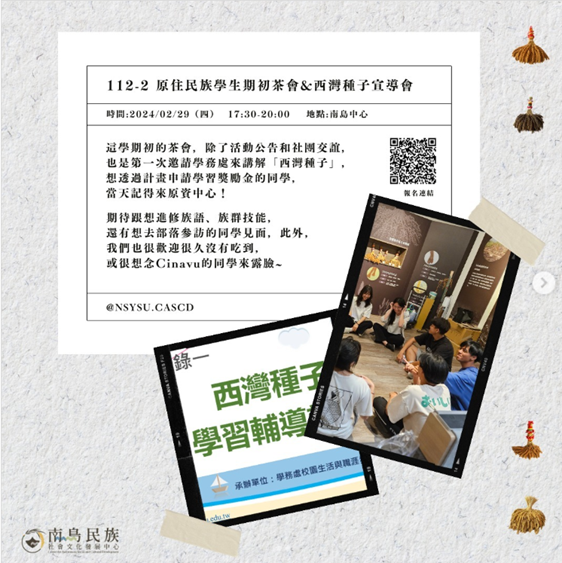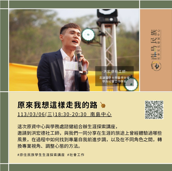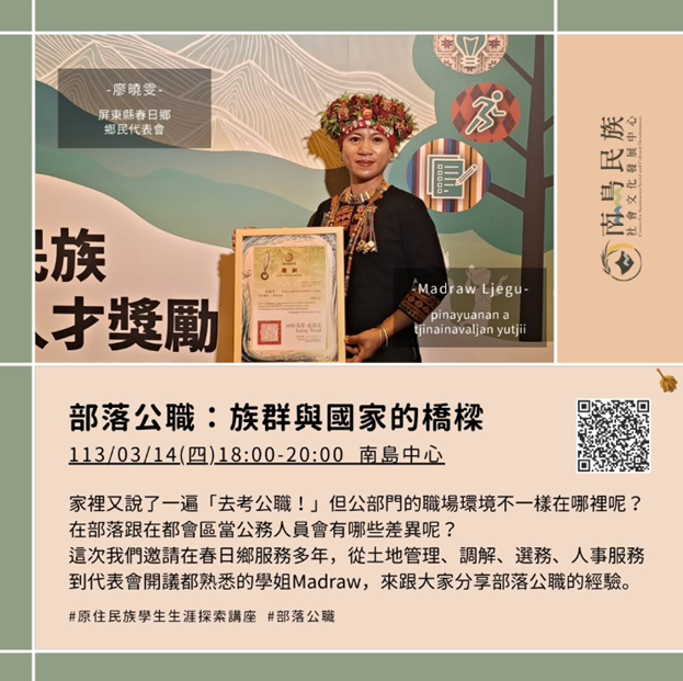 本校積極推動原住民族相關資源整合,除了社會科學院社會系和西灣學院設有原住民碩士在職專班,另設有南島民族社會文化發展中心、魯凱知識研究中心與原住民族學生資源中心,不僅提供在校學生充足的學習資源,也建構文化安全的環境與密集的人際網絡,讓學生在學習之餘也能在校園內獲得足夠的情感與文化支持。這樣的資源安排,有助於學生在課業之外,保持對原民議題的關注,並持續累積學術與實務經驗。