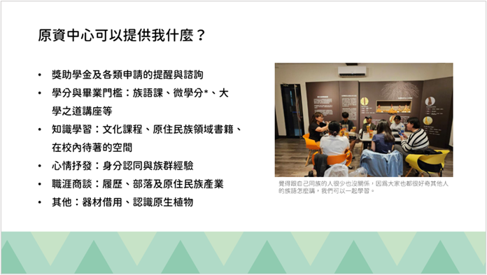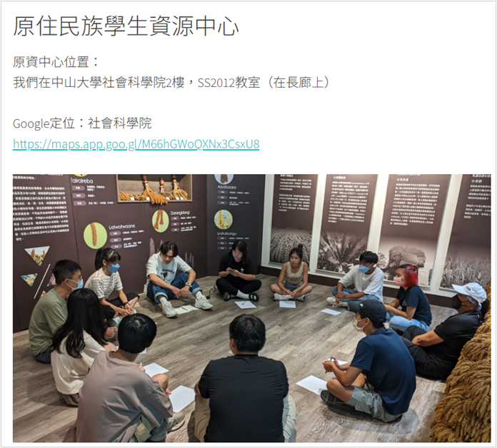 其中,原住民族學生資源中心設置於社會科學院2樓(SS2012室)。提供了原住民族學生在校時的支持,包含: