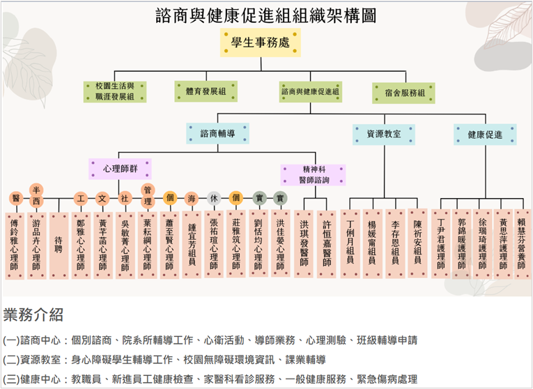 本校學務處資源教室統整協調校內身心障礙學生的輔導,以校內身心障礙學生為服務對象,提供生活、心理及生涯等方面的服務,並發揮支持與橋樑的角色,連結校內外資源,提供身心障礙學生所需的服務,協助他們進入本校學習的時候,也能接受特殊且符合個別需求之服務,以期能在最少隔離與限制的環境中,讓學生達到最好的學習效果,以順利完成高等教育。