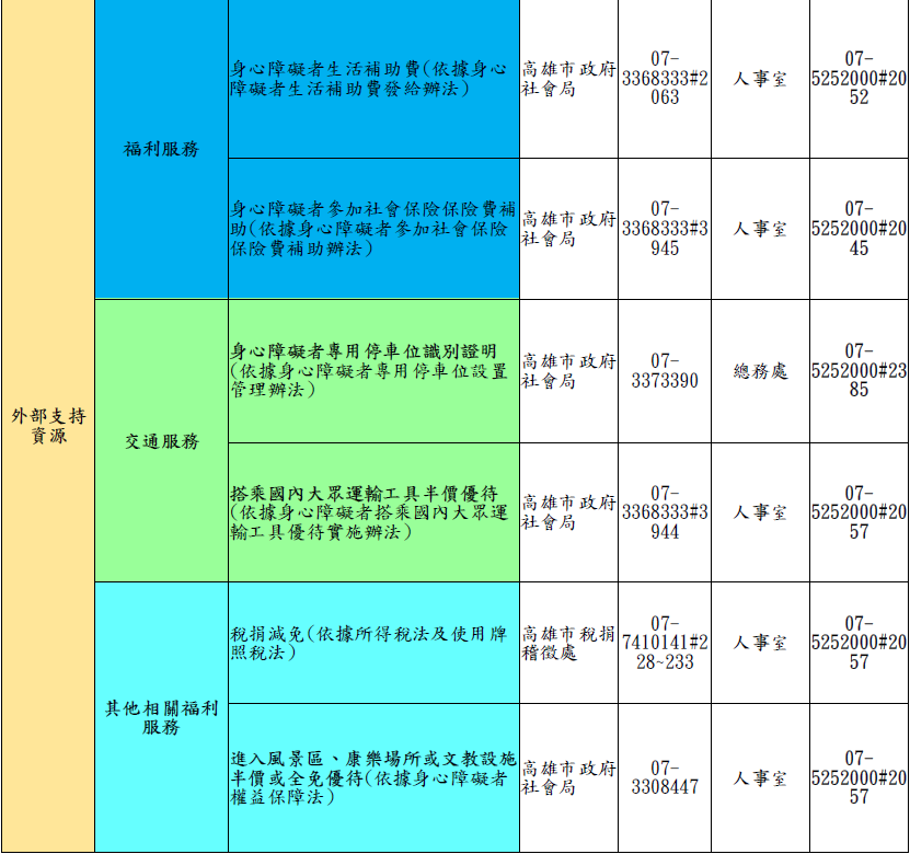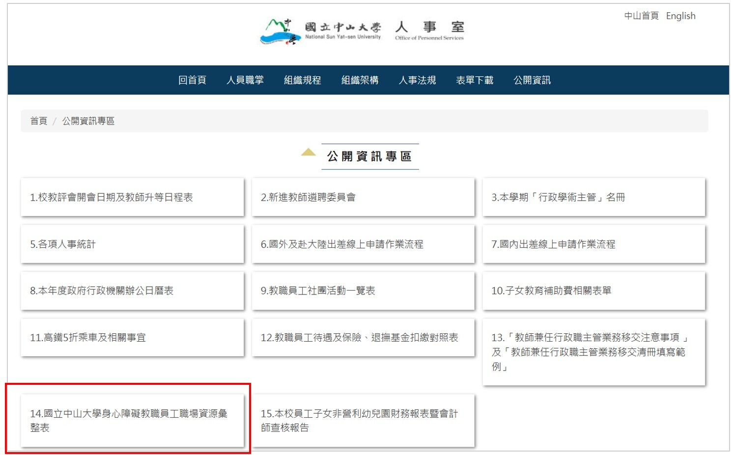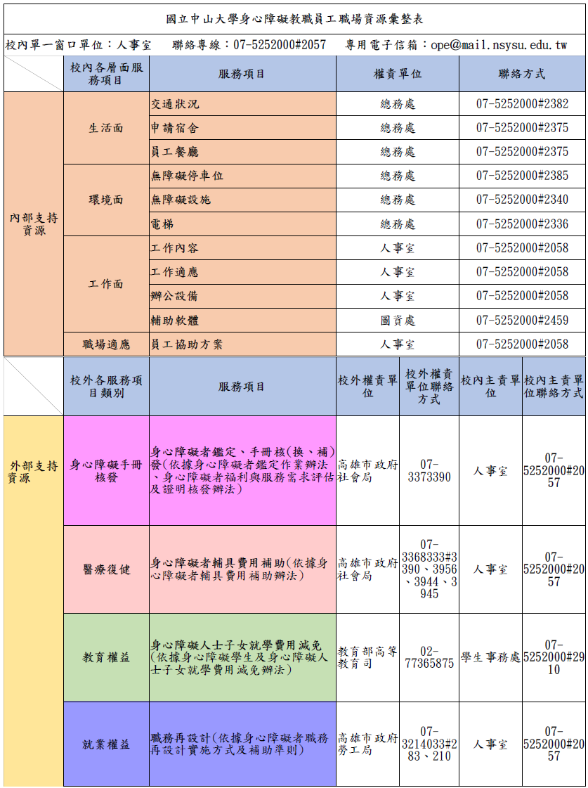 本校人事室網站公開資訊專區公開「國立中山大學身心障礙教職員工職場資源彙整表」,提供職員工相關資訊。