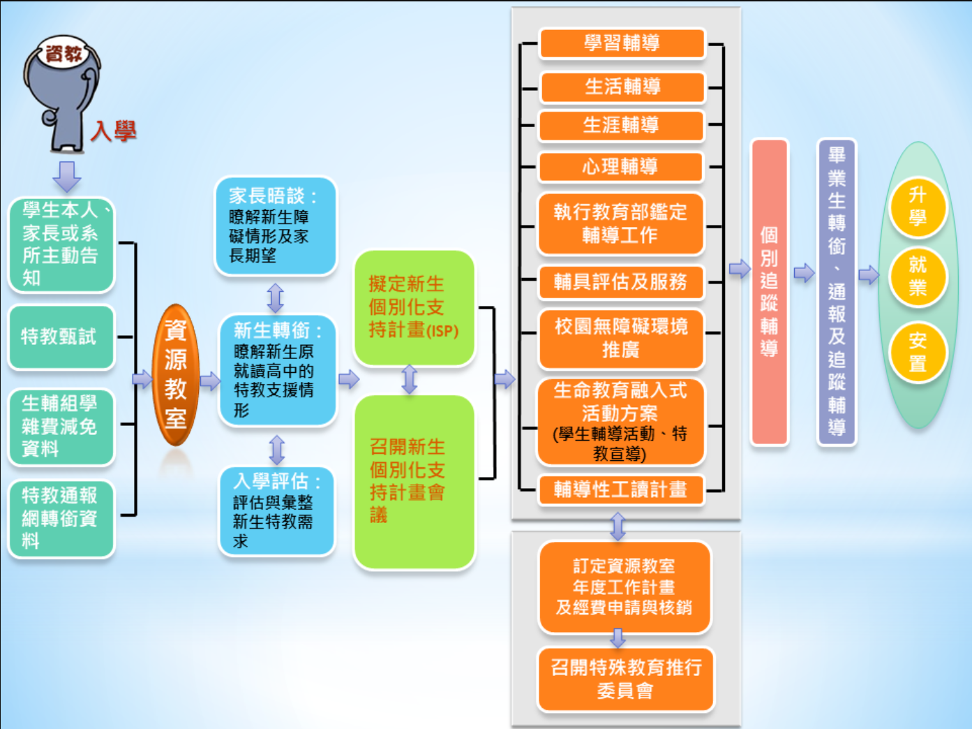 針對校內特教生,資源教室於學生入學前即邀請家長、系所主任、導師、系所行助理與會,共同為個案擬定個別化支持計畫(ISP),並依據該生障礙狀況和學習需求,提供其在校生活及課業上之協助,如上圖。2024年度共提供64位特教生個別化支持計畫。