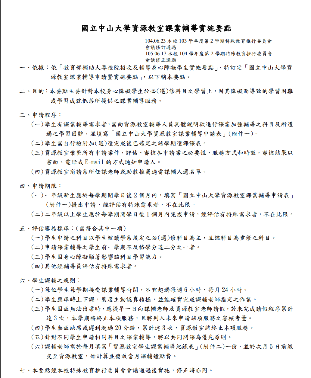 資源教室課業輔導申請程序、期限、審核標準等詳細資訊,如法規內容截圖如下,或本校法規專區:https://regs.nsysu.edu.tw/rule/rul_vie?rul=202005151633000200&v=i&idn=20210615194051
