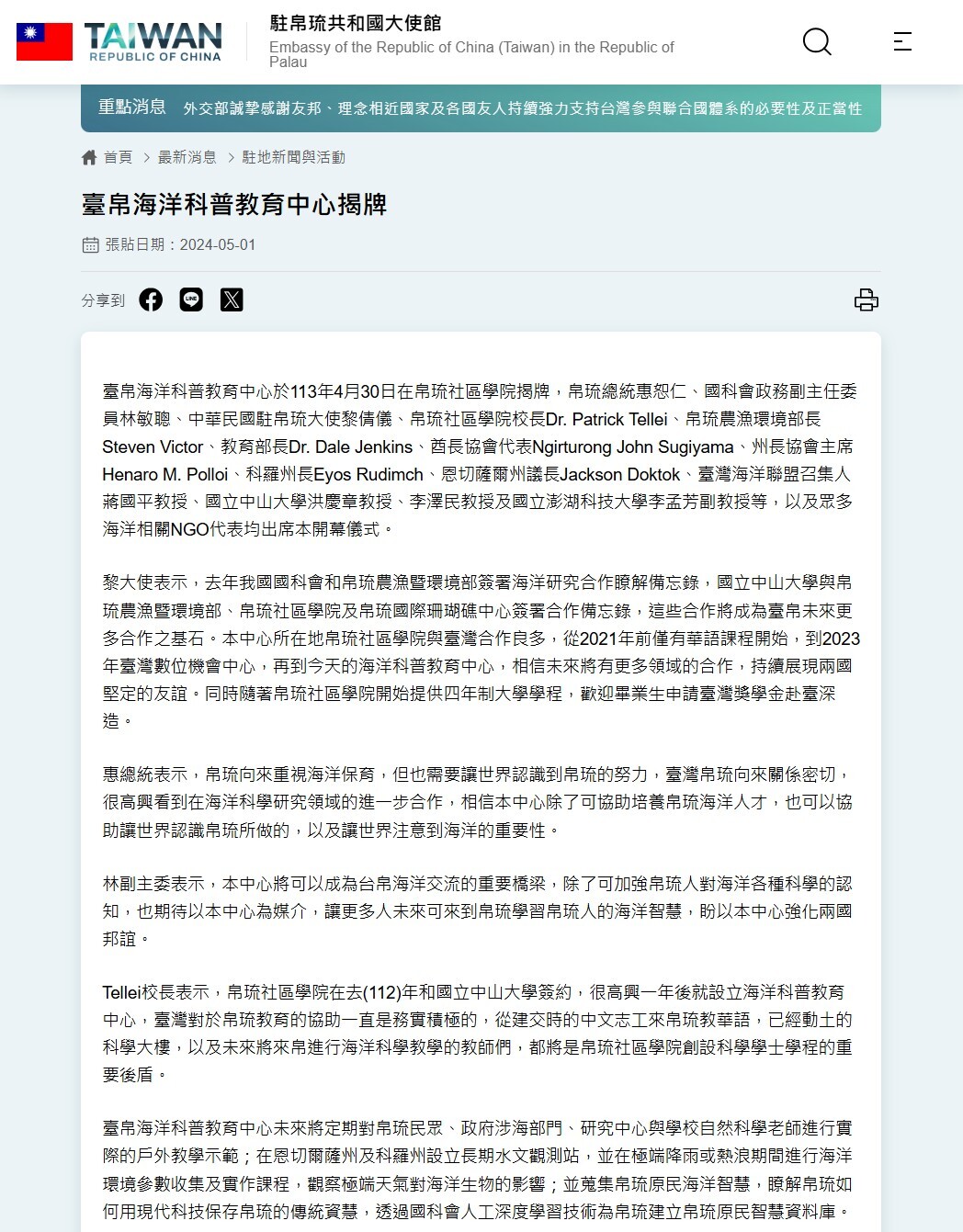 就亞太區域的合作,2024 年 4 月 30 日,本校於帛琉社區學院揭牌成立「臺帛海洋科普教育中心」,由帛琉總統、國科會副主委林敏聰及中華民國駐帛琉大使林東亨共同主持,帛琉國會議員及農漁暨環境部、教育部等相關部會亦踴躍出席,顯示本中心設立不僅獲得兩國政府高度支持,亦成為雙邊合作的重要里程碑。該中心肩負推動海洋教育、強化科學研究、協助帛琉面對氣候變遷與極端災害挑戰之任務,並將持續作為兩國間科學交流及知識共享的主要平台。中心的設立展現了我國在區域性氣候治理與海洋科學領域的責任與貢獻,也鞏固了臺帛邦誼。未來更規劃跨領域合作,例如結合人工智慧與海洋科學進行大數據分析,以應用於氣候變遷監測、災害預警與資源管理,推動帛琉建立完整的災害因應策略。