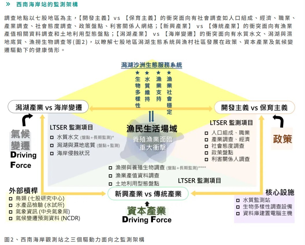 就與地方政府合作而言,國科會攜手國立中山大學成立全國唯一聚焦「西南海岸」的長期社會生態核心觀測站,未來將針對七股地區潟湖生態系統與漁村社區發展,包括漁業資源、環境變化、土地利用及社會結構等,進行全面性的現場監測、資料盤點及分析,針對地方議題,評估人類活動及氣候變遷對生態和社會的影響,以供政府制定永續發展的政策方針。