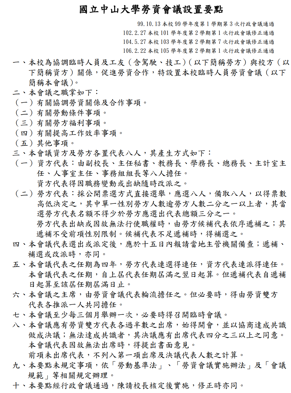 我國憲法第14條明定我國人民有集會及結社之自由,是以本校承認所有人的工會及勞工權利,本校並設有勞資會議保障勞工權益。本校亦訂定「國立中山大學勞資會議設置要點」,以協調勞資關係,促進勞資合作。另包含教師聯誼會、女性教師聯誼會、學生會。