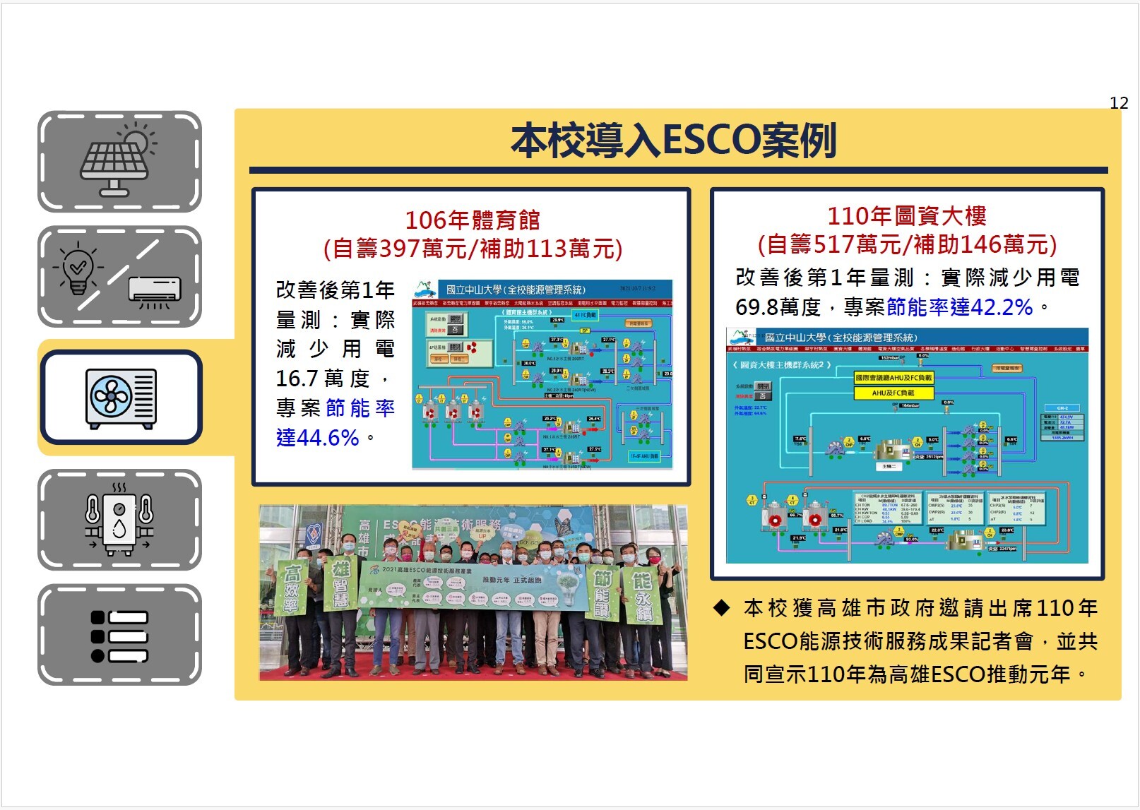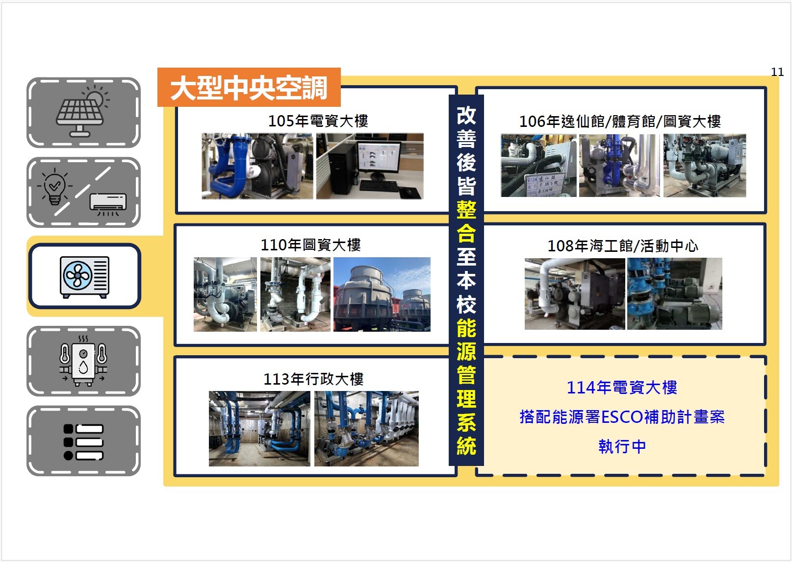 本校使用大型中央空調的有電資大樓、逸仙館、圖資大樓、體育館、行政大樓、活動中心、國研大樓、海工館等共8棟建築物,而本校自2014開始至今,針對多棟建物進行老舊中央空調主機及周邊設備的汰換,並建置變頻控制、監控系統進行負載管理。