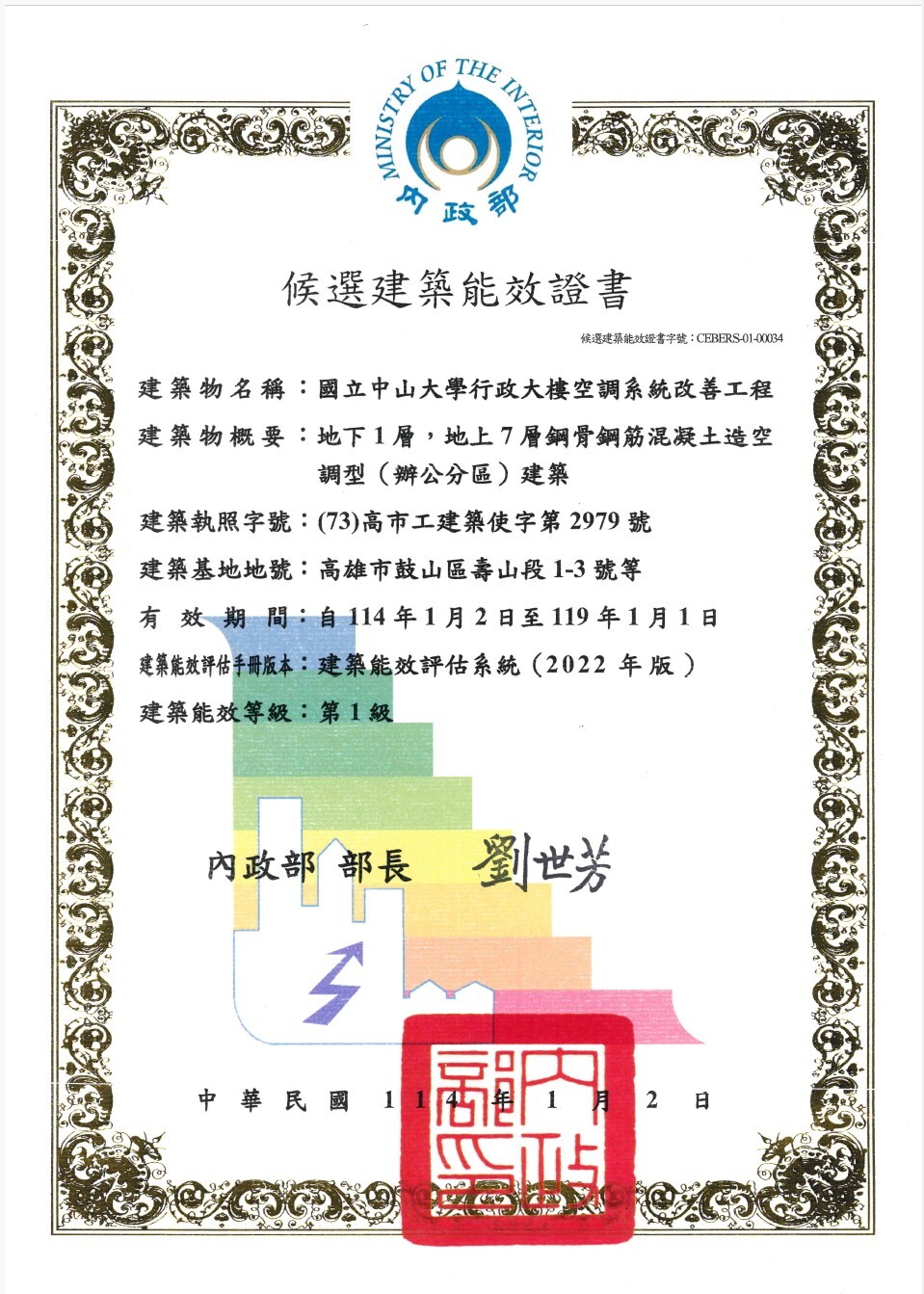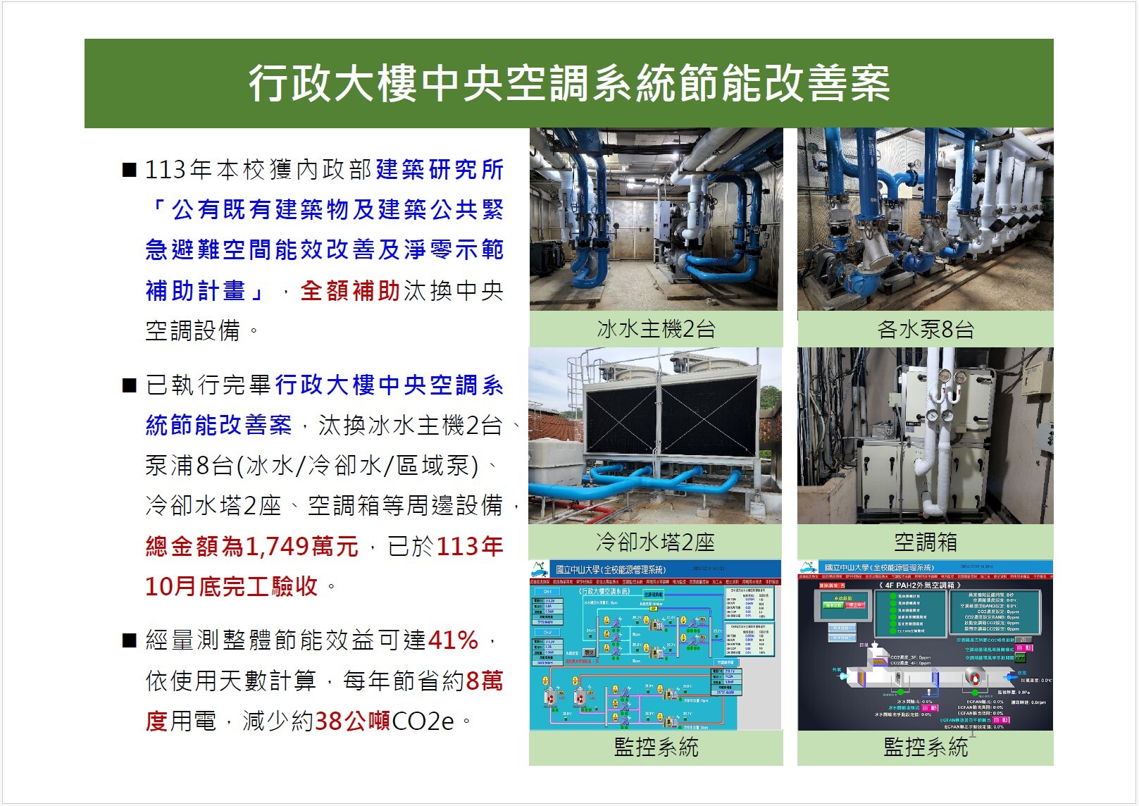 2024年獲內政部建研所補助辦理行政大樓整體中央空調系統設備改善,汰換冰水主機2台、泵浦8台(冰水/冷卻水/區域泵)、冷卻水塔2座、空調箱等周邊設備,改善後行政大樓建築物能效由原先5級提升至能效1級,節能效益經量測節能率可達41%,依使用天數計算,每年節省約6萬度用電,減少約28公噸CO2e。