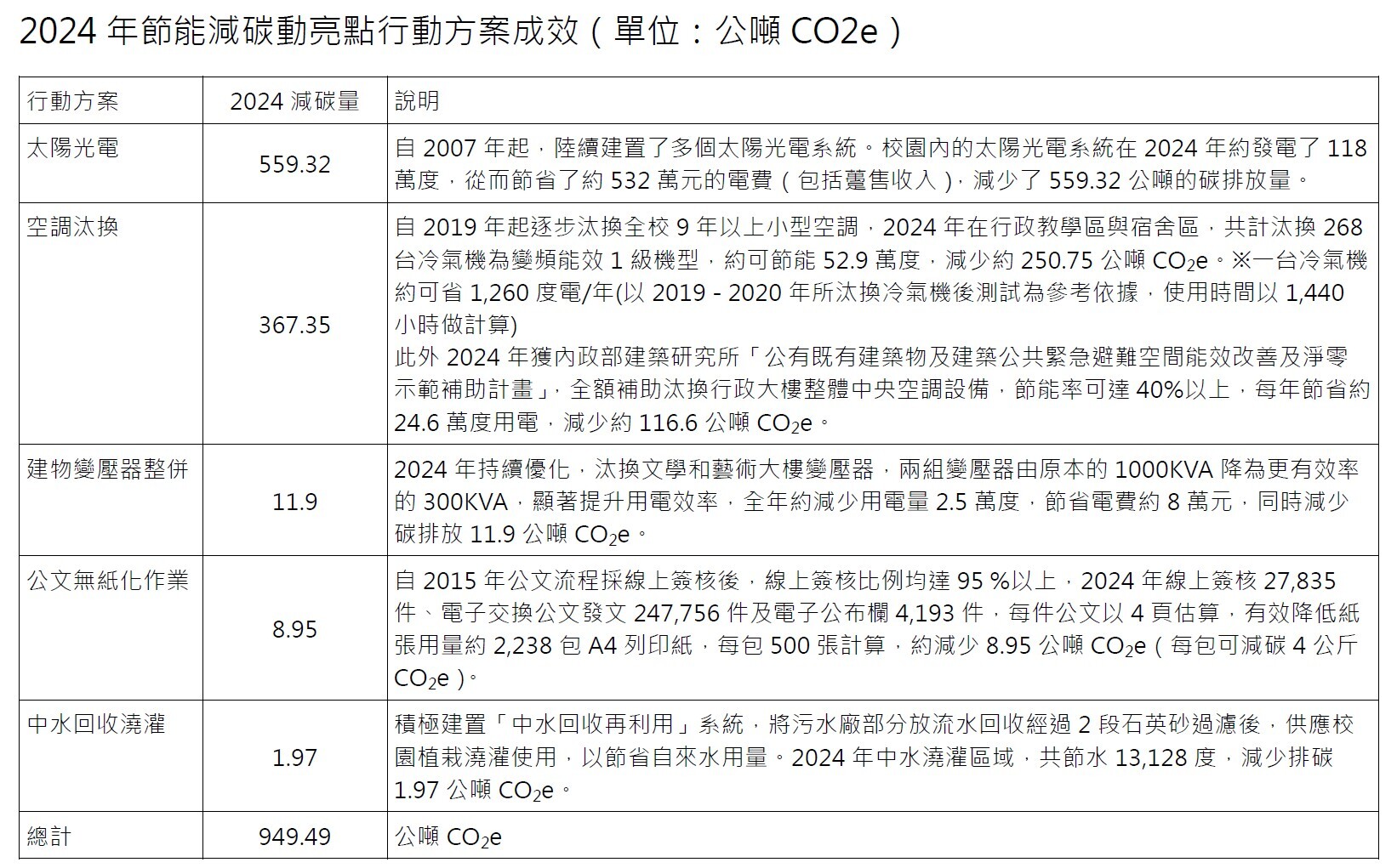 本校歷年皆規劃並執行相關節能減碳措施,且每年填報於能源署非生產性質行業能源查核申報,以降低整體能源消耗,提升能源效率。2024年主要規劃太陽光電使用、空調汰換、建築物變壓器整併、公文無紙化作業和中水回收澆灌等措施。在上述項目執行後,每年可減少約949.49公噸CO2e。