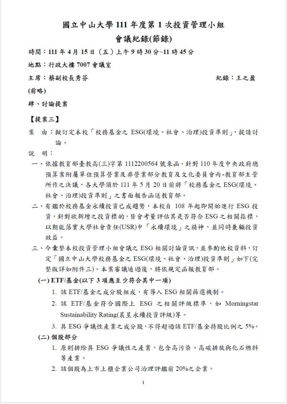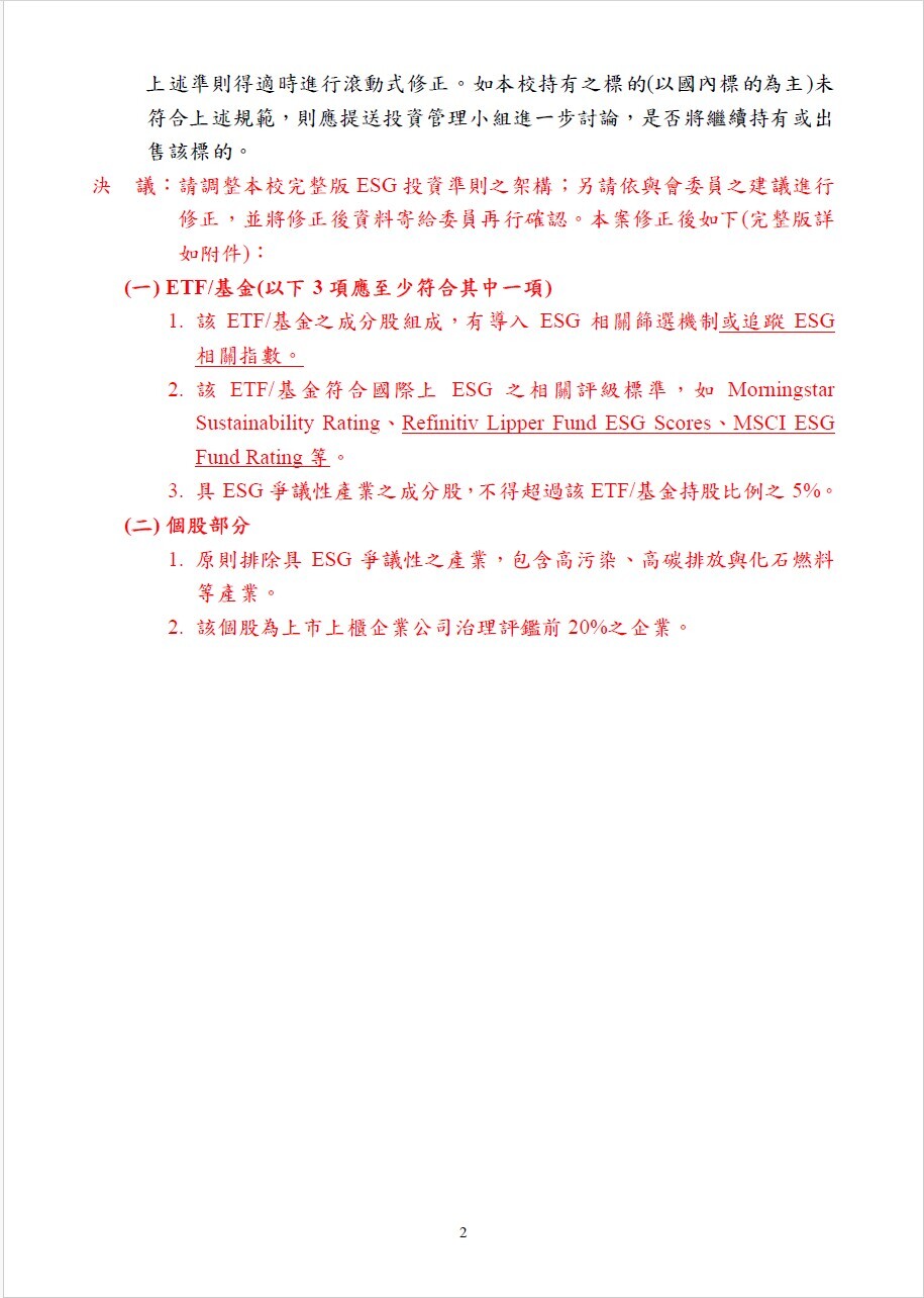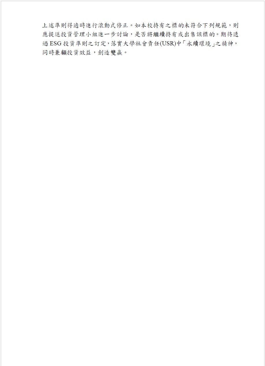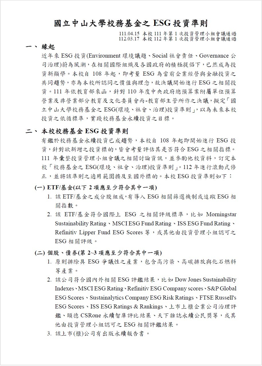 本校業於111年訂定「國立中山大學校務基金之ESG(環境、社會、治理)投資準則」,並於112年3月進行滾動式修正並函報教育部,以臻完備;且本校目前持有之標的皆符合ESG投資準則之規範,並將依據該投資準則持續進行校務基金投資,以落實大學社會責任(USR)中「永續環境」之精神,兼顧投資效益,創造雙贏。
