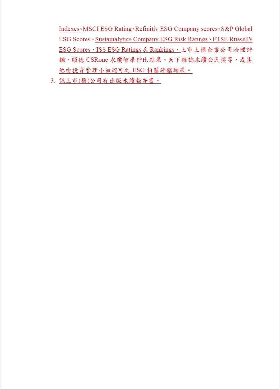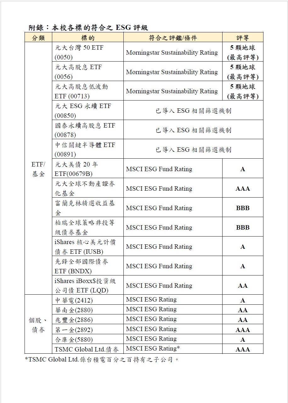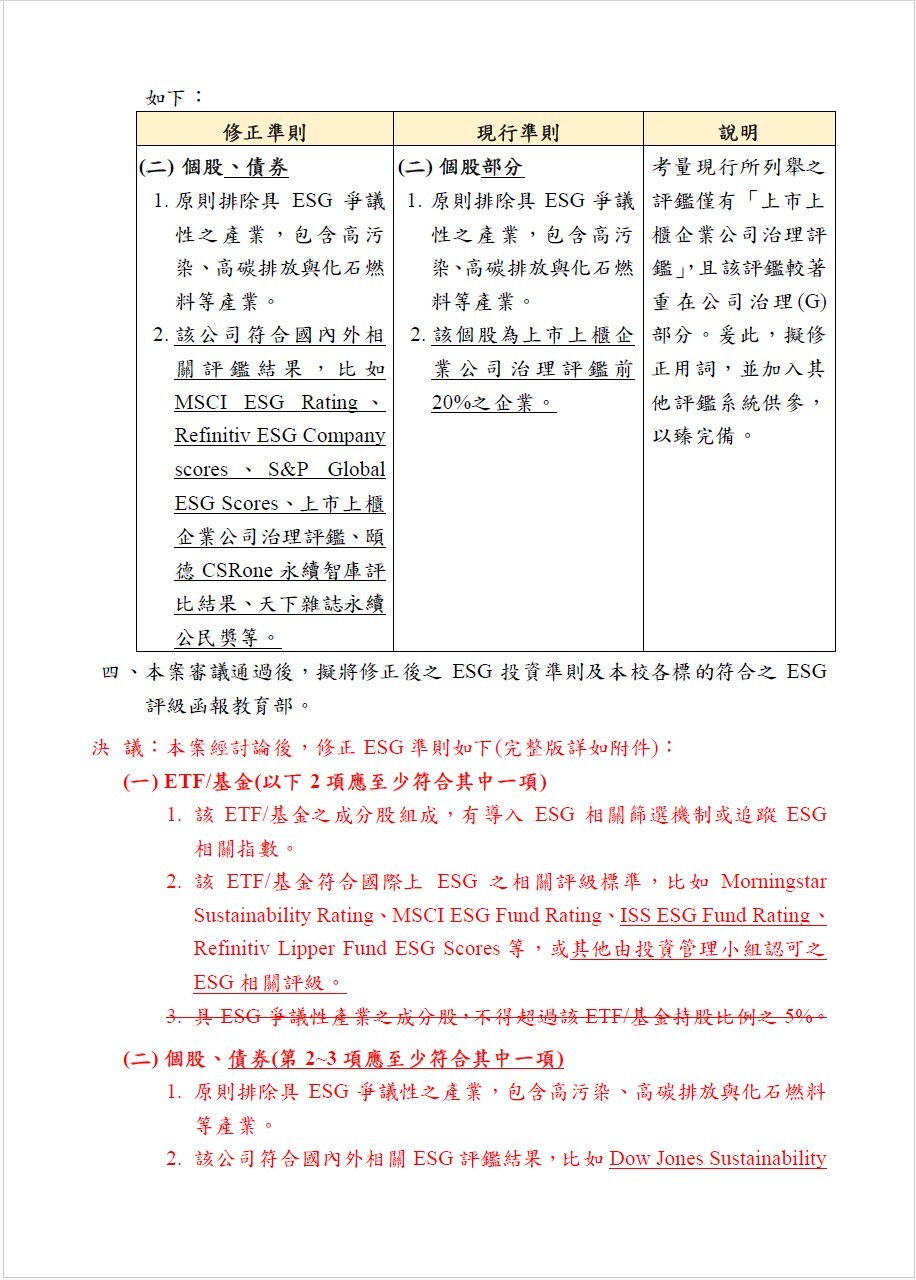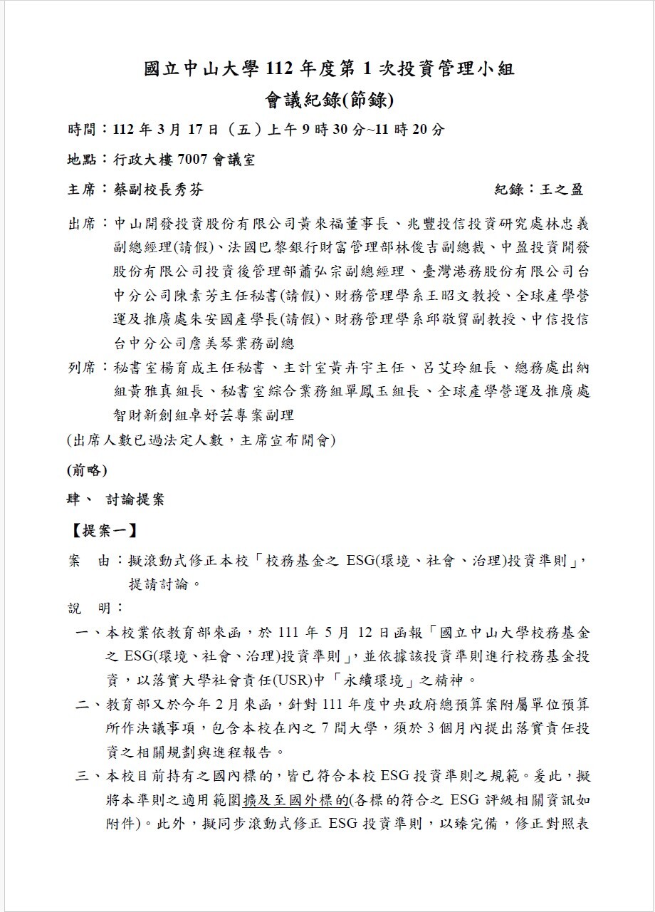 本校業於111年訂定「國立中山大學校務基金之ESG(環境、社會、治理)投資準則」,並於112年3月進行滾動式修正並函報教育部,以臻完備;且本校目前持有之標的皆符合ESG投資準則之規範,並將依據該投資準則持續進行校務基金投資,以落實大學社會責任(USR)中「永續環境」之精神,兼顧投資效益,創造雙贏。