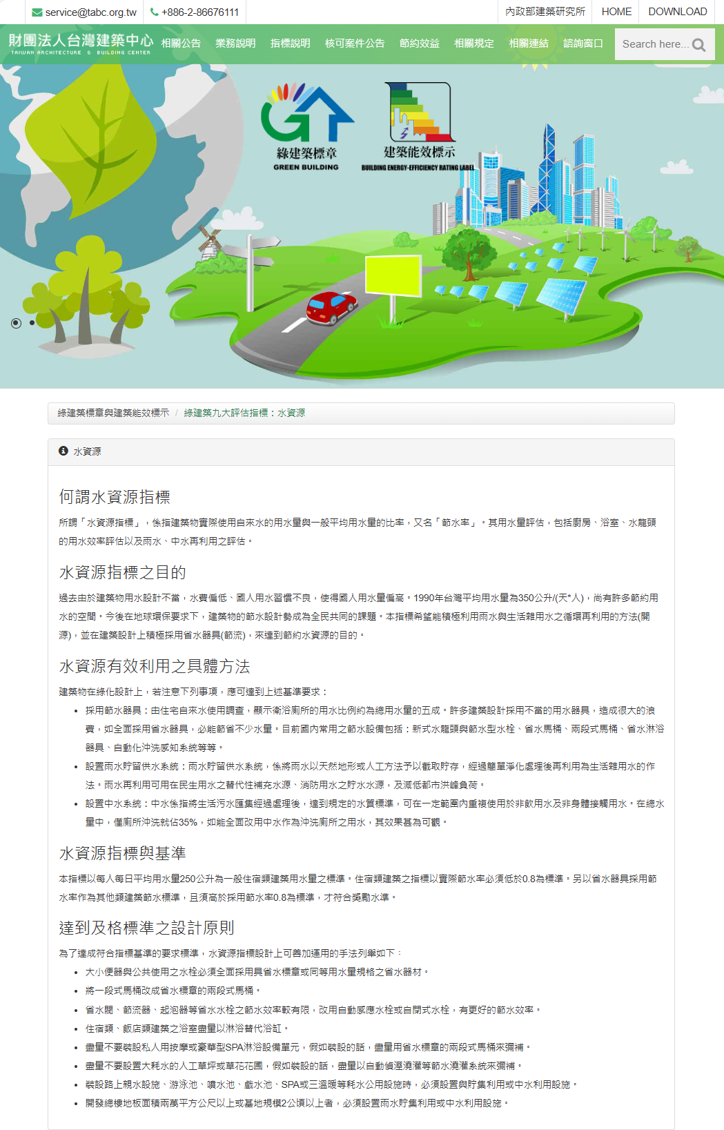 過去由於建築物用水設計不當,水費偏低、國人用水習慣不良,使得國人用水量偏高。1990年台灣平均用水量為350公升/(天*人),尚有許多節約用水的空間。今後在地球環保要求下,建築物的節水設計勢成為全民共同的課題。本指標希望能積極利用雨水與生活雜用水之循環再利用的方法(開源),並在建築設計上積極採用省水器具(節流),來達到節約水資源的目的。