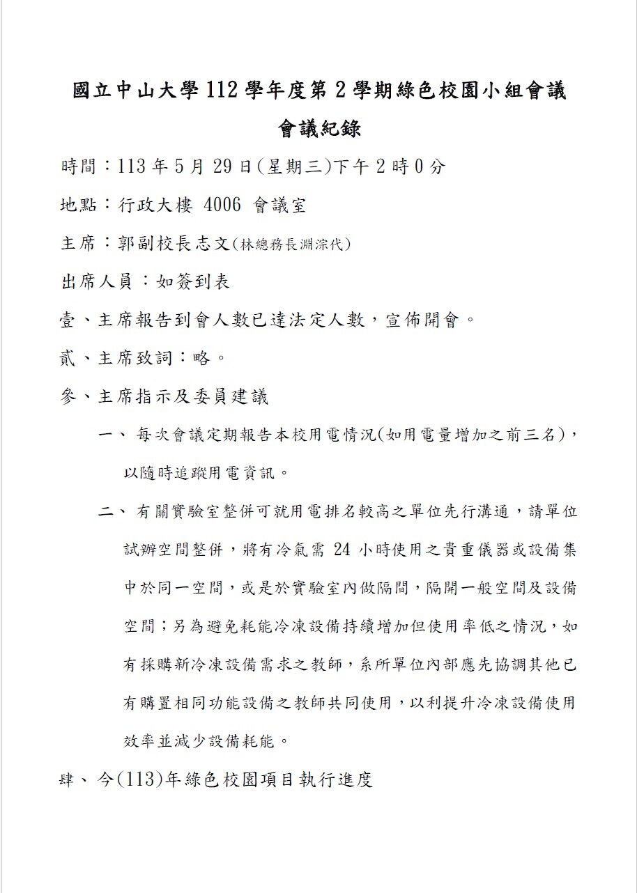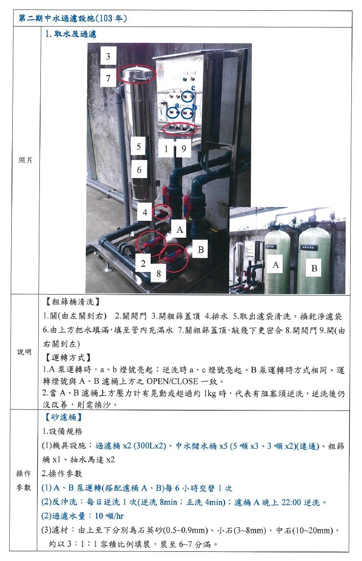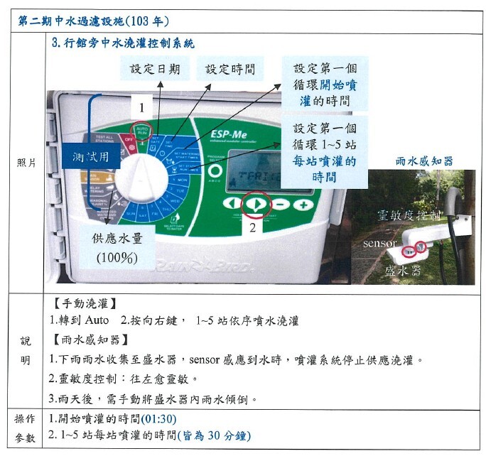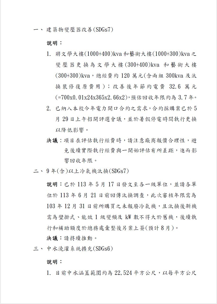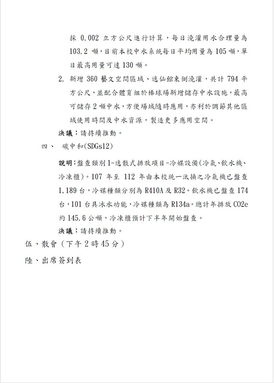 針對中水回收水使用政策,於「綠色校園小組會議」提出「中水澆灌系統擴充(SDGs6) 」改善作為,經會議討論,決議持續推動。