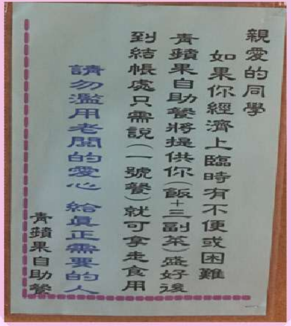 本校餐廳及福利社如:米羅、翠亨E餐(青蘋果自助餐)及超商友善時光,提供愛心餐幫助解決飢 餓的問題。重大節日提供免費應景餐點供給。(如中秋佳節提供月餅或是冬至提供熱鹹湯圓)