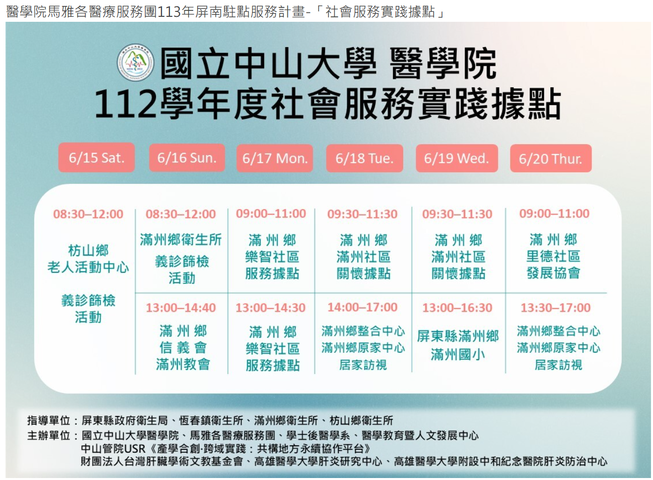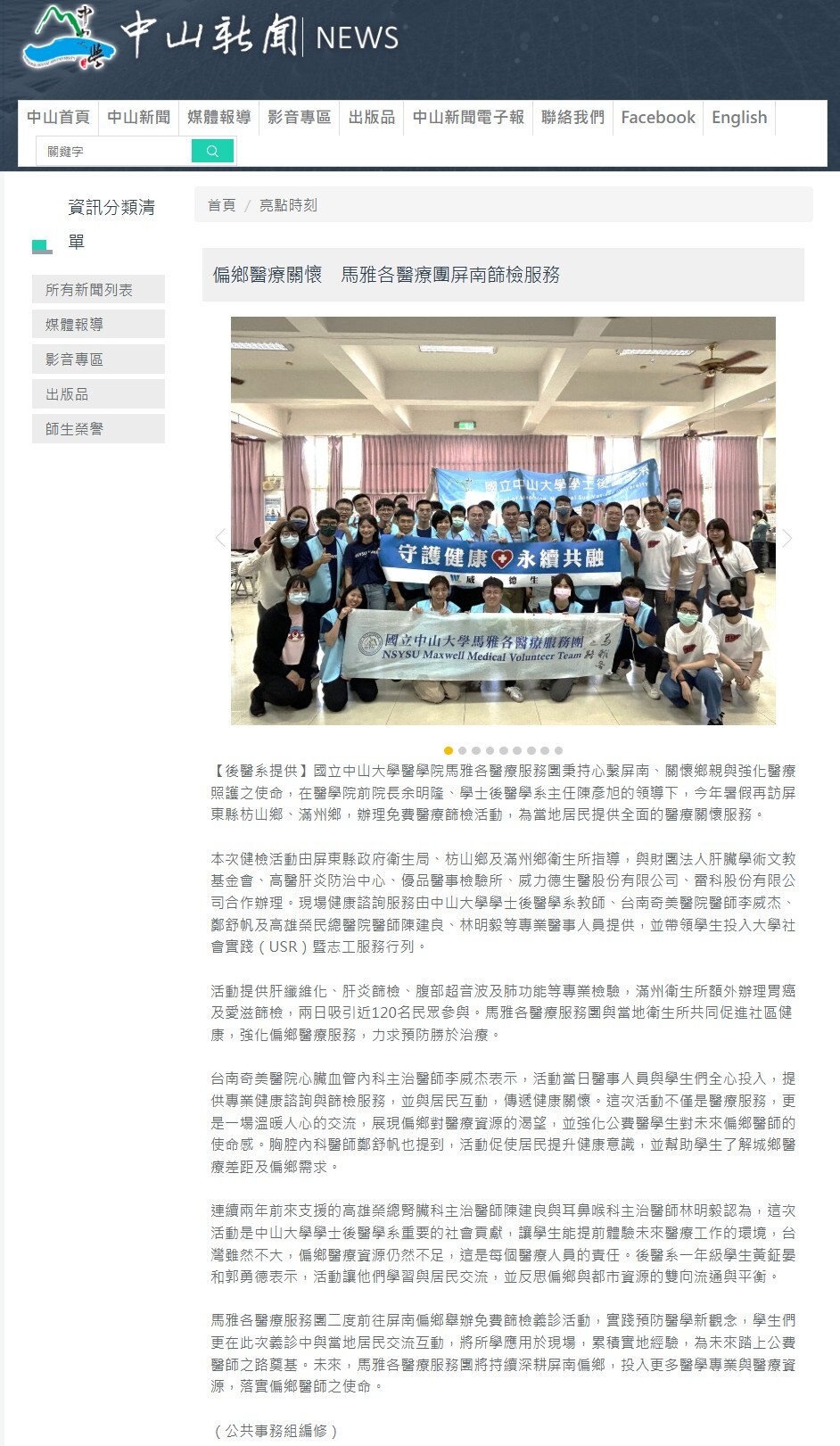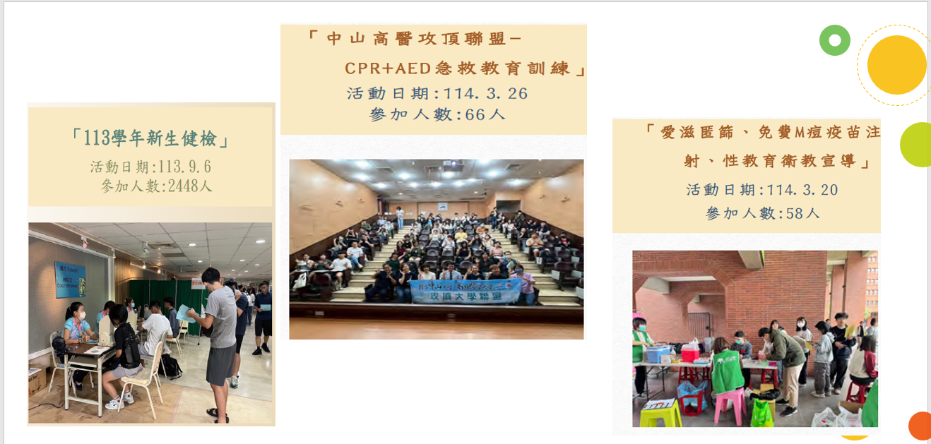 中山大學與多個在地機構合作,辦理健康醫療活動,例如: