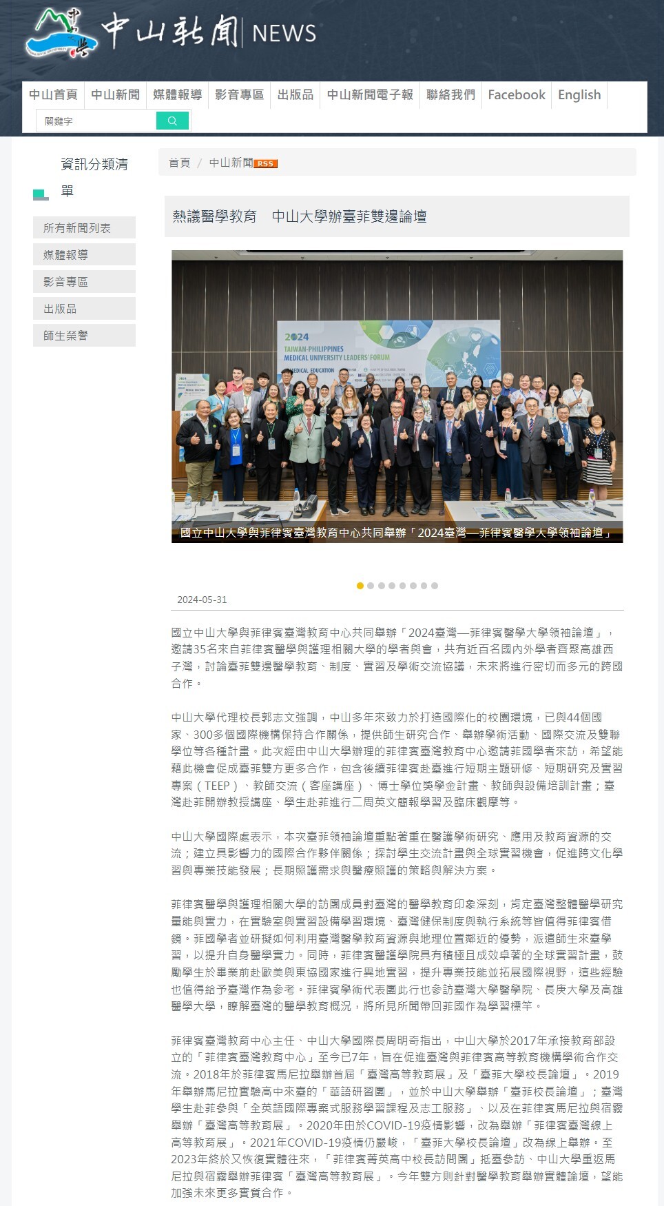 中山大學與菲律賓臺灣教育中心共同舉辦「2024臺灣—菲律賓醫學大學領袖論壇」,邀請35名來自菲律賓醫學與護理相關大學的學者與會,共有近百名國內外學者齊聚高雄西子灣。本次臺菲領袖論壇重點著重在醫護學術研究、應用及教育資源的交流;建立具影響力的國際合作夥伴關係;探討學生交流計畫與全球實習機會,促進跨文化學習與專業技能發展;長期照護需求與醫療照護的策略與解決方案。