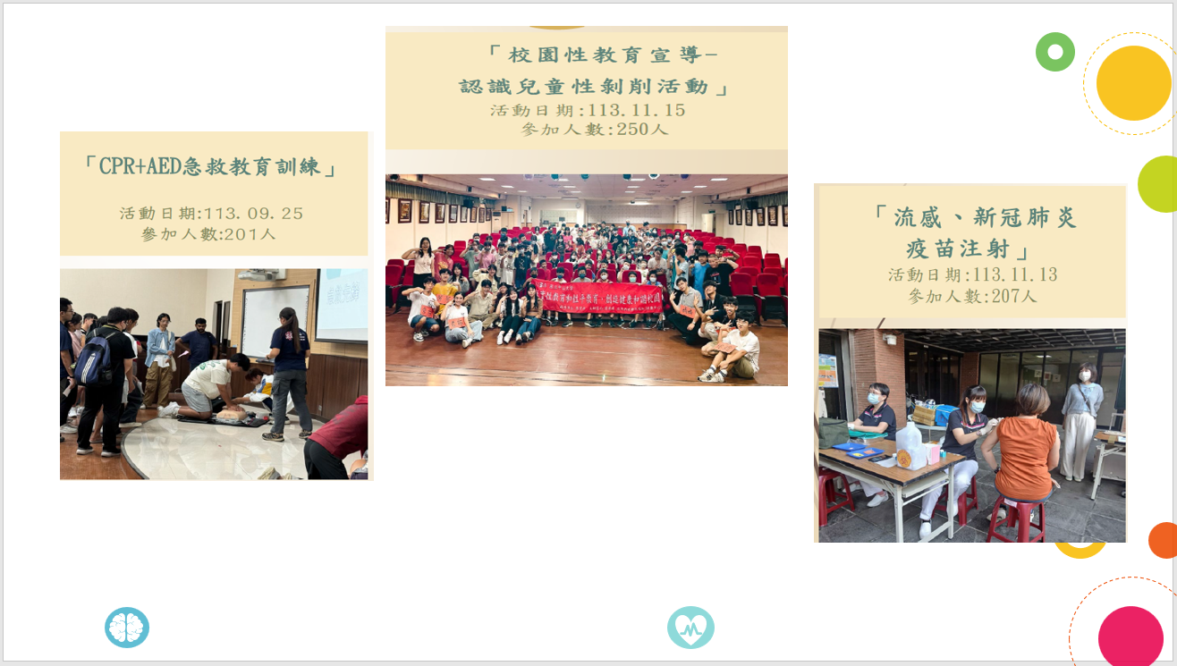 1.與高雄市消防和高雄醫學大學附設醫院共同辦理CPR+AED急救訓練活動。