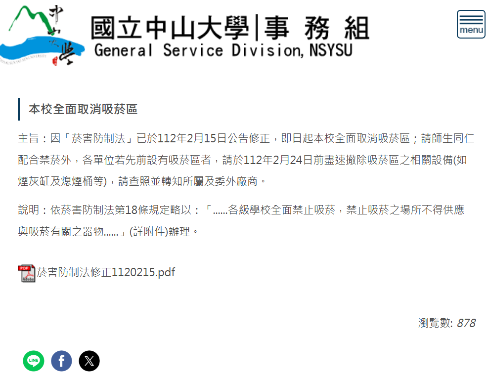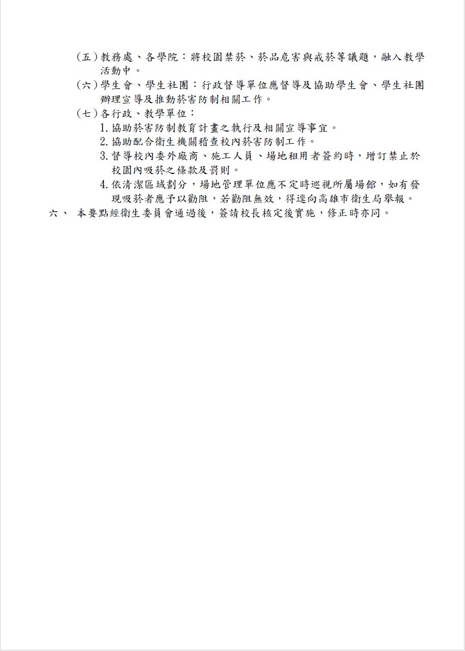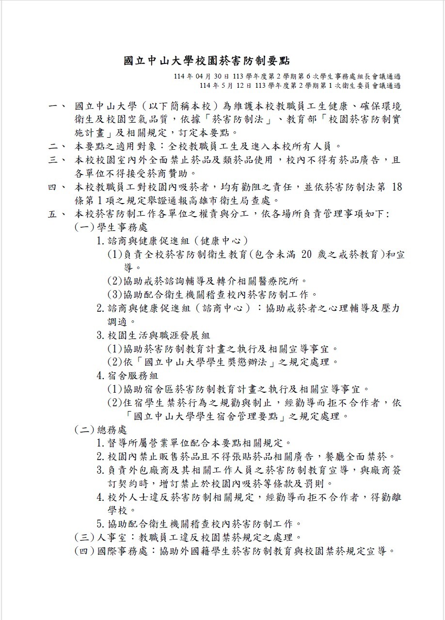 本校依循中央菸害防制法,全面禁菸,並已逐步完成「國立中山大學校園菸害防制要點」之訂定。