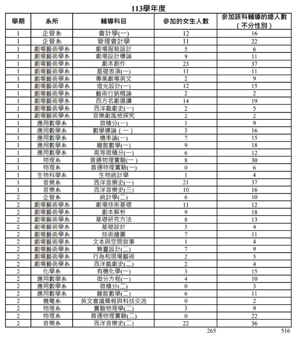 本校教發中心每學期初函請各學系申請開授學習輔導角落暨補救教學課程,由各學系安排教授推薦且該科目表現優異的學生擔任課輔助理,以協助有學習需求之學生進行課業輔導。各學習輔導助理得提供專業科目、學習方法、學習態度、時間安排等方面的輔導,以增進學習成效低落學生之學習效能。113學年度265名女性學生參與補救教學課程(佔參與人數的51.36%)。